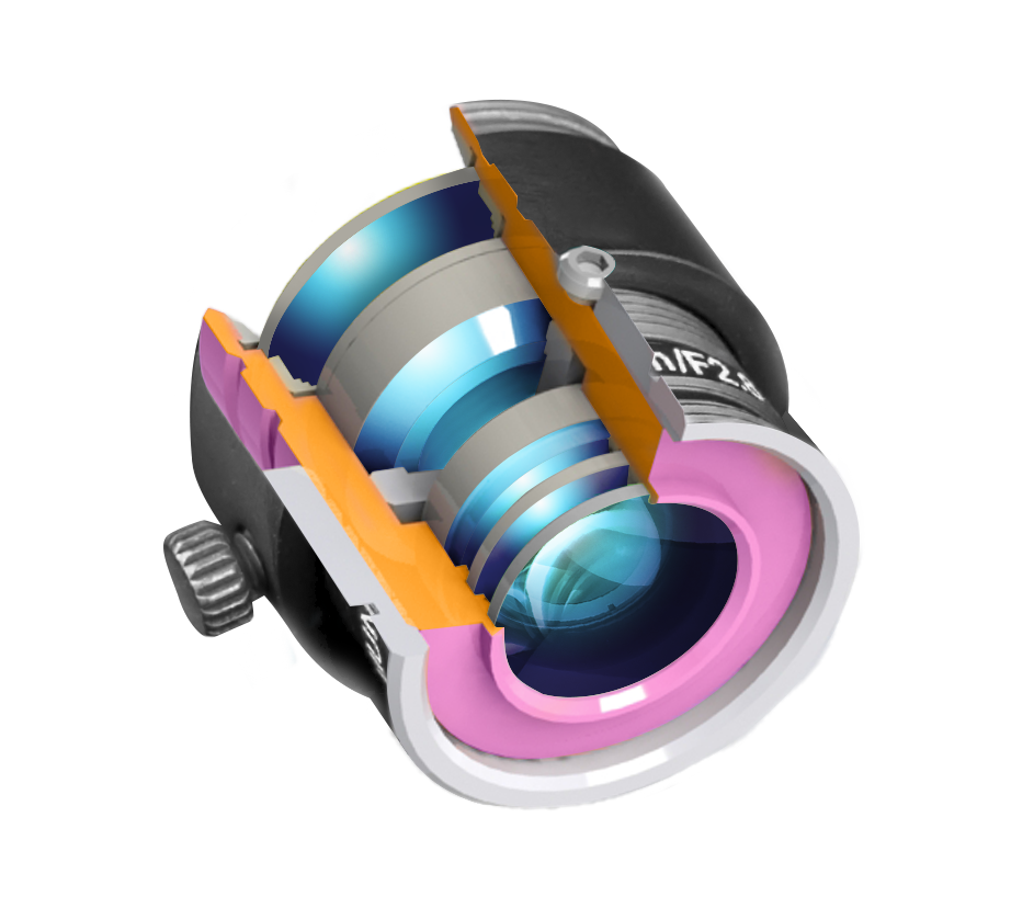 위 그림에서와 같이 조절식 조리개는 고정식 구경 조리개로, 부피가 큰 배럴 기반의 초점 메커니즘은 단일 스레드와 강철 잠금 링으로 교체되었습니다. 이와 같은 기계적 개조는 다른 유형의 강건설계에도 적용되는 기본적인 개념으로서 제품 수명을 향상시키는 장점을 가지고 있습니다. 산업 등급의 강건설계 렌즈는 반복적인 가속과 움직임을 필요로 하는 비전 시스템이 설치된 공장 자동화 환경에 안성맞춤입니다.