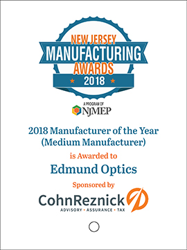 Edmund Optics® (EO), the premier provider of optical components, was honored as a 2018 Business of the Year for companies that employ 51-250 employees by the New Jersey Manufacturing Extension Program.