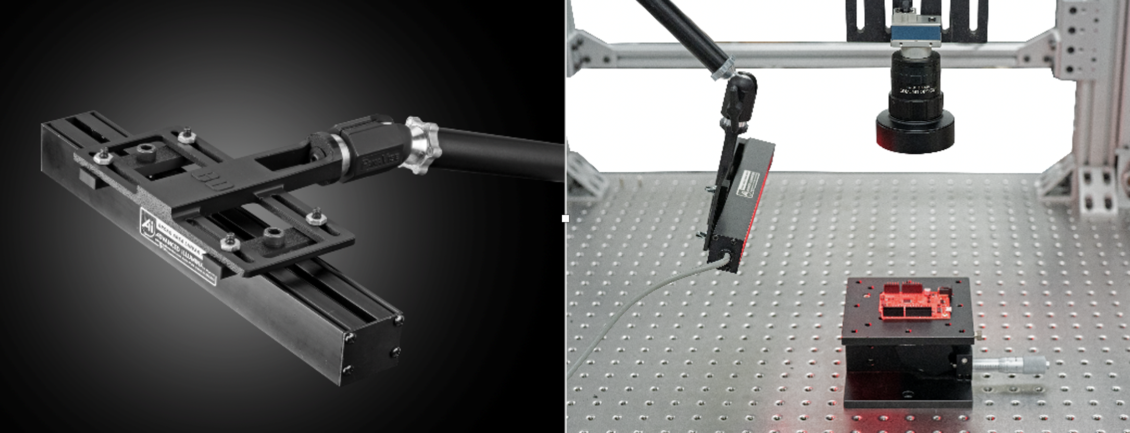 The illumination mounts designed by Edmund Optics® combine versatility, stability, and ease of use to support a wide range of machine vision lighting setups. With adjustable 3D printed brackets, Articulating Arm Systems offered by Edmund Optics®, and compatibility with 80/20 frames or optical tables, these mounts simplify integration for high-performance imaging applications. This flexibility also makes it easy to integrate into existing setups without the need for custom adapters. Whether it’s used for just benchtop prototyping or full-scale production environments, the system supports quick re-positioning and secure mounting, vastly reducing setup time.