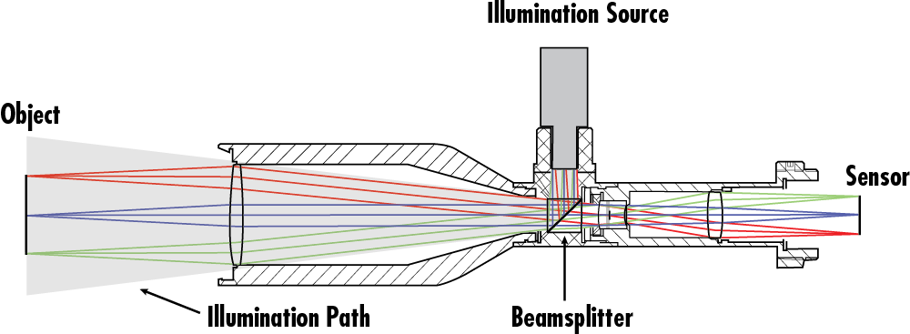 In-line illumination, when paired with a telecentric imaging lens, is a powerful technique for high-precision machine vision applications that require detection of low-contrast surface features or through-hole inspection. This coaxial lighting method directs light along the optical axis of the imaging lens using a beamsplitter, enabling even, shadow-free illumination that highlights surface defects, etched marks, or transparent features with minimal specular reflection (Figure 1). Telecentric lenses further enhance this setup by ensuring uniform magnification across the field of view and eliminating perspective errors, which is critical for accurate dimensional measurements. In this application note, example images of objects with different surfaces are observed with in-line illumination. The images below were taken with the 0.69X CobaltTL Telecentric Lens using a diffuse, white spot light to minimize hot spots.