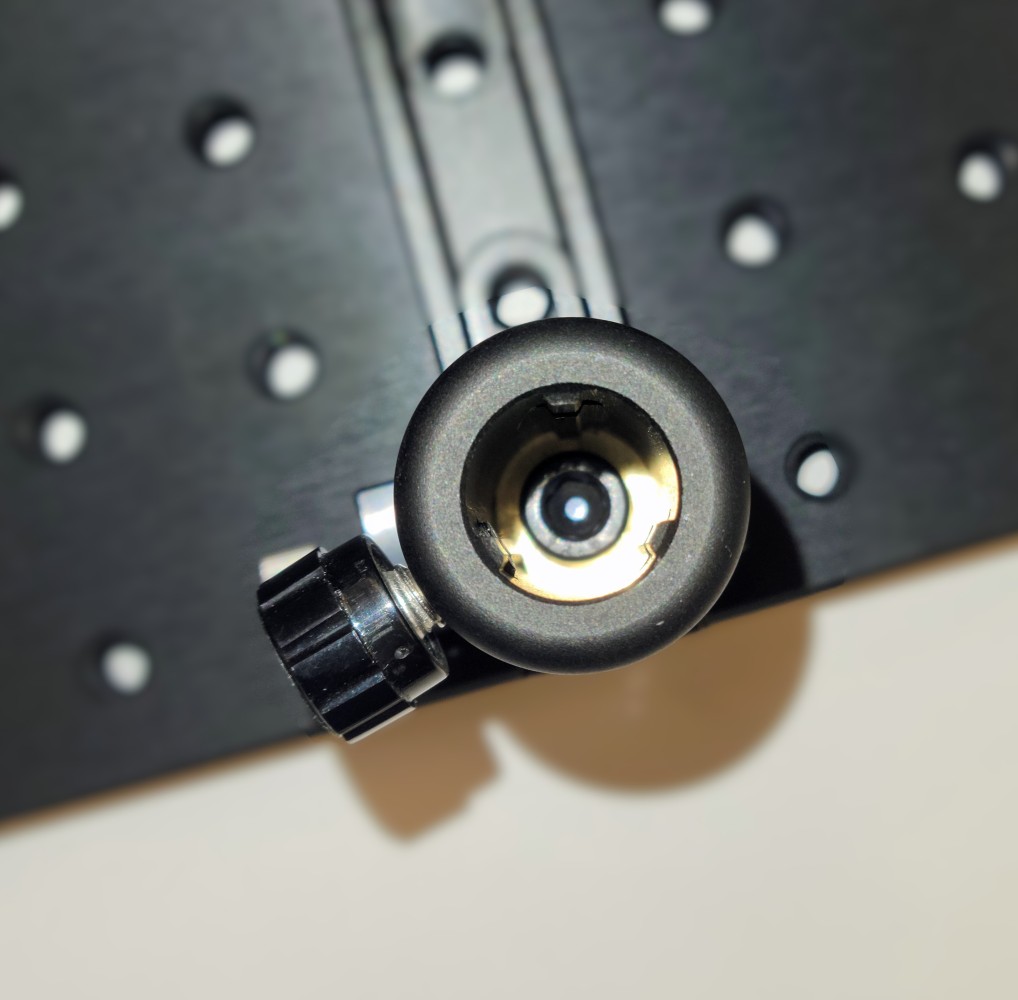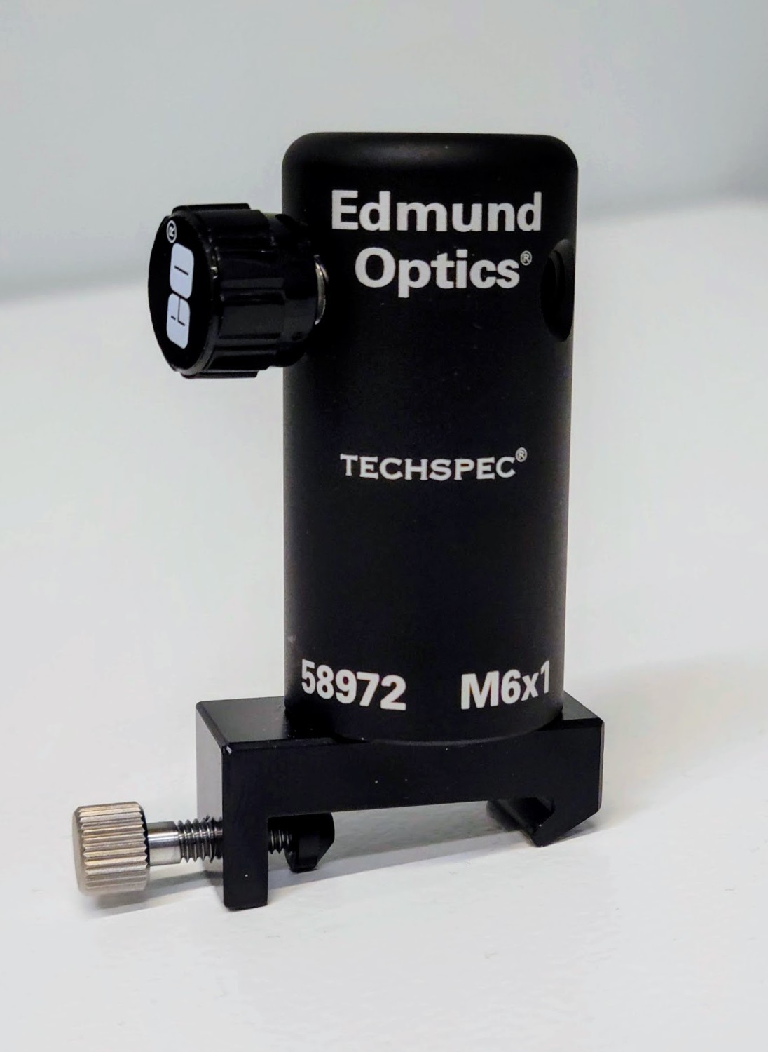 For the laser assembly, mount the E-Series ID Adapter into the E-Series Kinematic Mount and then insert the laser and tighten the set screw, as shown in Figure 4. The laser with stock number 26-938 recommended in the table above is sold as 10mW. For safety reasons, you can use the laser software to reduce the output power to only 1mW. When considering options, you might find that a red diode laser or a comparable low-power laser like stock number 72-817 is also a suitable choice based on availability and budget constraints. It is worth noting that diode lasers possess adequate coherence for educational demonstrations, as you will see in this experiment. Figure 5 shows the laser assembly mounted to a post.