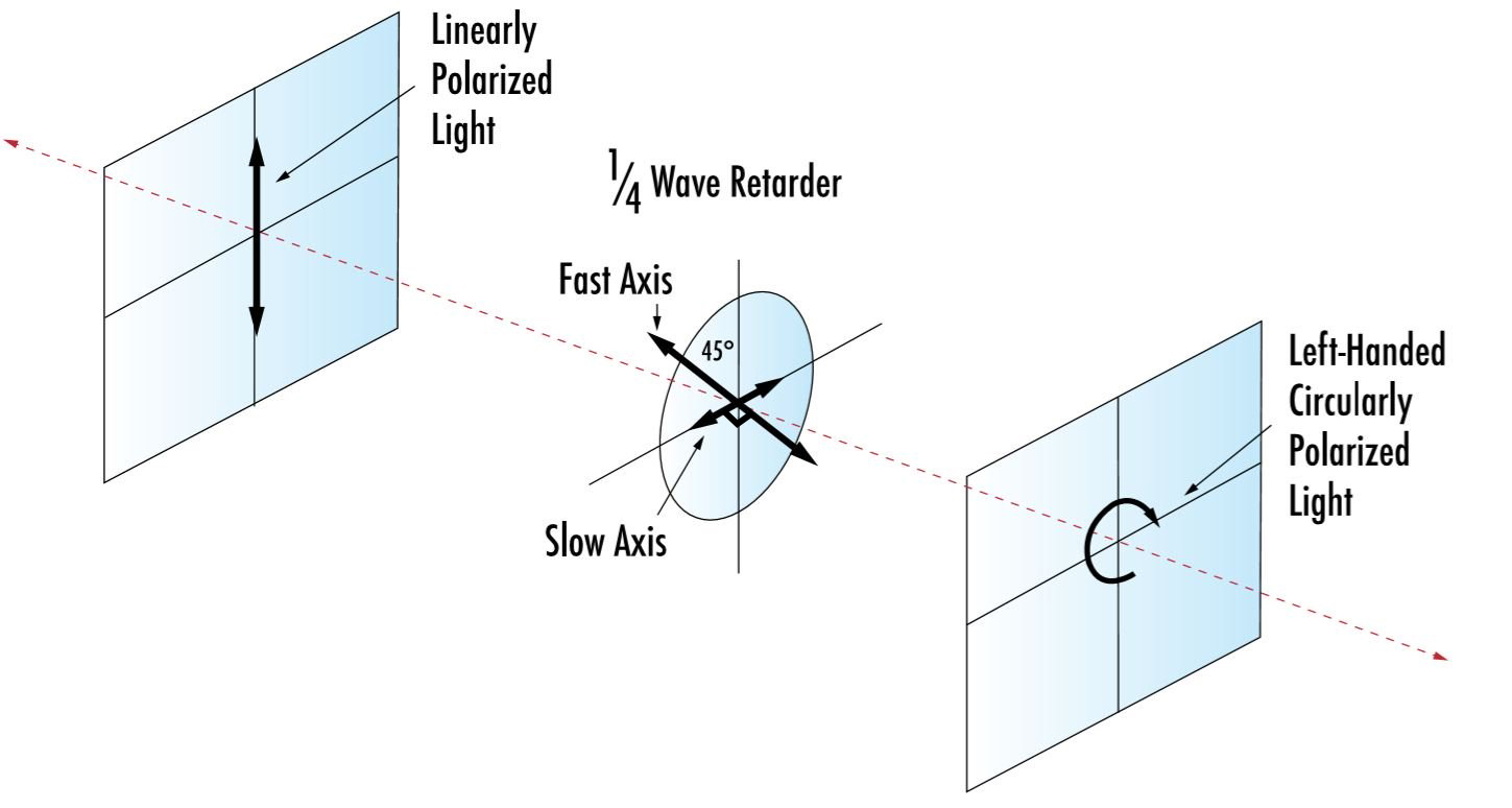 선형 폴라라이저와 λ/4 웨이브플레이트를 서로 특정 방향에 위치시킴으로써 선형 편광된 빛은 원형 편광의 빛으로 변형될 수 있으며, 그 반대로도 가능합니다. 예를 들어, 선형 편광으로부터 45° 방향의 축의 λ/4 웨이브플레이트를 사용하면 원형 편광이 만들어집니다. 쉽게 방향을 가늠할 수 없는 원형 편광은 λ/4 웨이브플레이트를 통과하여 45° 방향의 축을 가진 선형 편광을 만들어냅니다. 또한, 선형으로 편광된 빛이 45° 외의 다른각으로 λ/4 웨이브플레이트에 입사되면, 타원형으로 편광이 만들어집니다.