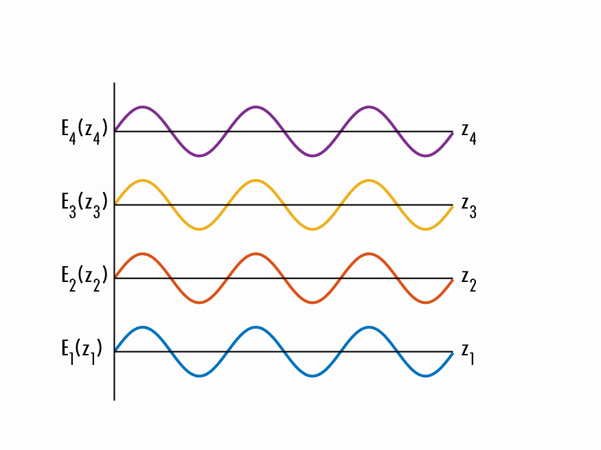 그림 3에는 기본 사인파를 포함한 4개의 retardation 값이 나와 있습니다. 주황색 파장은 1/4만큼, 노란색 파장은 1/2만큼, 보라색 파장은 3/4만큼, 파란색 파장은 1만큼의 retardation가 있습니다. λ/4 retardation은 사인파를 코사인파로 바꾸고, full wave retardation는 파장 자체를 지연시킵니다. 가장 널리 사용되는 웨이브플레이트는 쿼터 및 하프 웨이브플레이트인데, 추가적인 retardation 값을 얻기 위해 겹쳐서 사용할 수 있기 때문입니다.